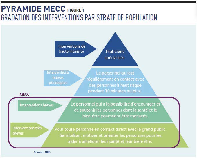 Validée par la gouvernance au printemps 2024, elle est désormais déclinée sur l’ensemble des missions du CHU : soins, enseignement et recherche 2. La démarche MECC a le mérite de déployer une vision intégrée du patient et de sa prise en charge, reposant principalement sur les personnels paramédicaux. Concrètement, quel que soit le motif de venue, il s’agit de repérer de la manière la plus systématique possible certains facteurs de risques pour les patients, de déployer un programme d’interventions très brèves à brèves (ce qui équivaut à l’approche « repérage précoce et intervention brève » en addictologie 3) et de proposer une orientation vers un parcours de soins adapté et structuré (intra-CHU, en ville, vers des partenaires associatifs, etc.).