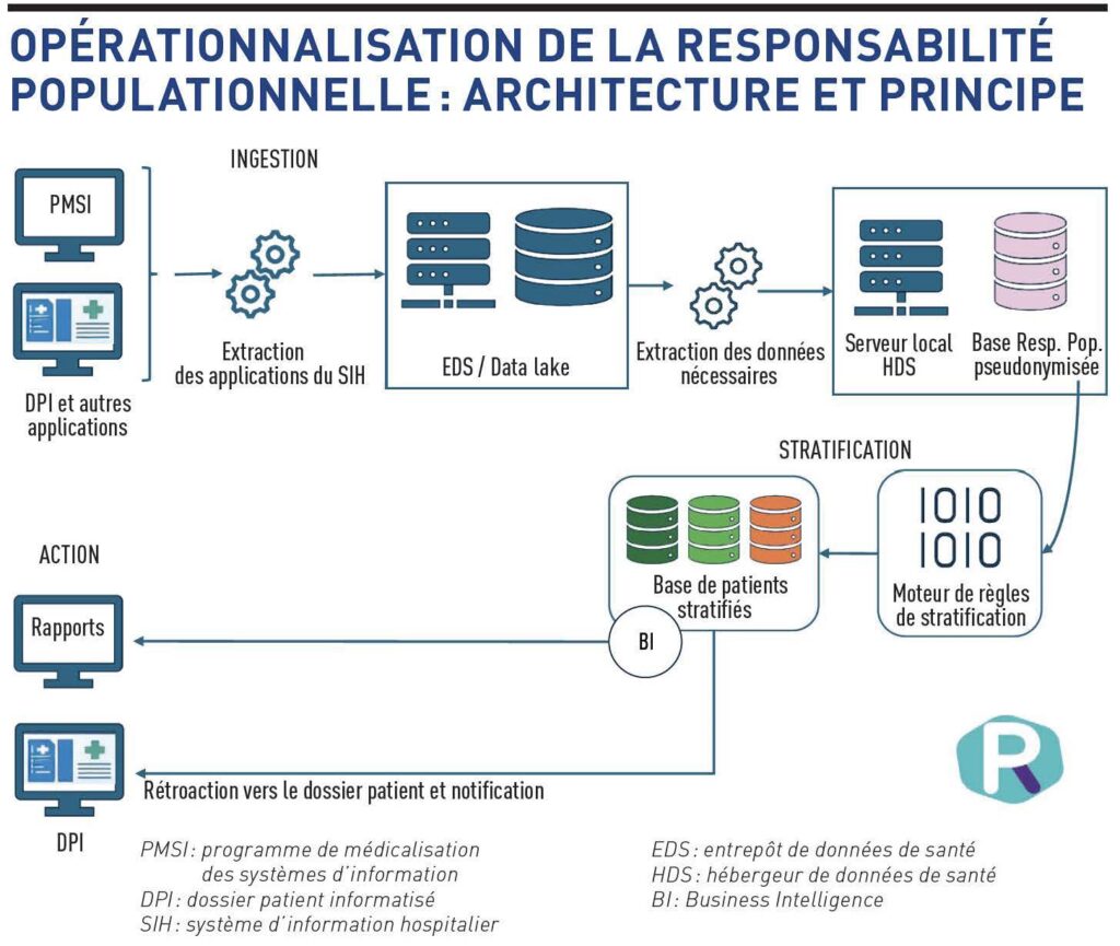 Une fois la stratification réalisée, l’architecture technique donne une vue de la population classée selon ses risques, ce qui permet d’éditer tous les tableaux de bord nécessaires à la prévention et au pilotage de la santé. La responsabilité populationnelle ne se limite pas à produire des tableaux de bord statistiques, l’enjeu est de pouvoir passer de l’analyse globale à l’action concrète auprès des patients et des professionnels.